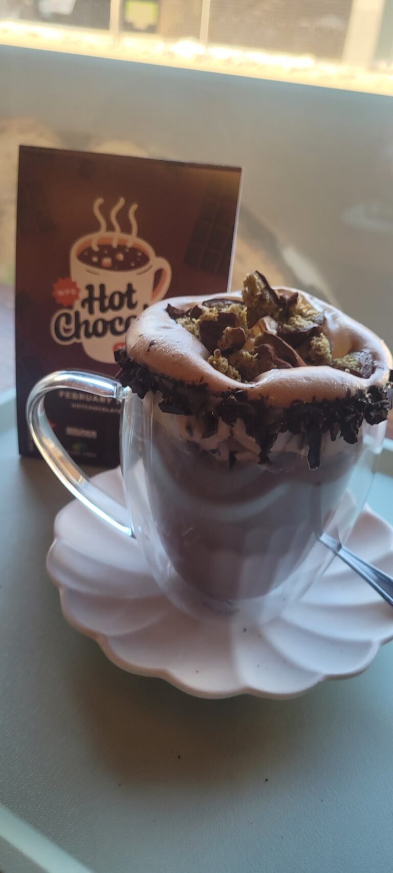 Cocoa powder and milk with Dubai cookies( Pistachios(nuts), Kadaif(wheat), white chocolate) , and whipped cream on top Oat, soy milk available